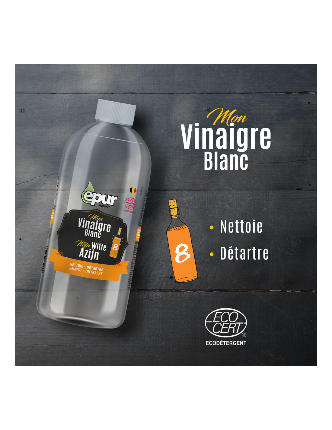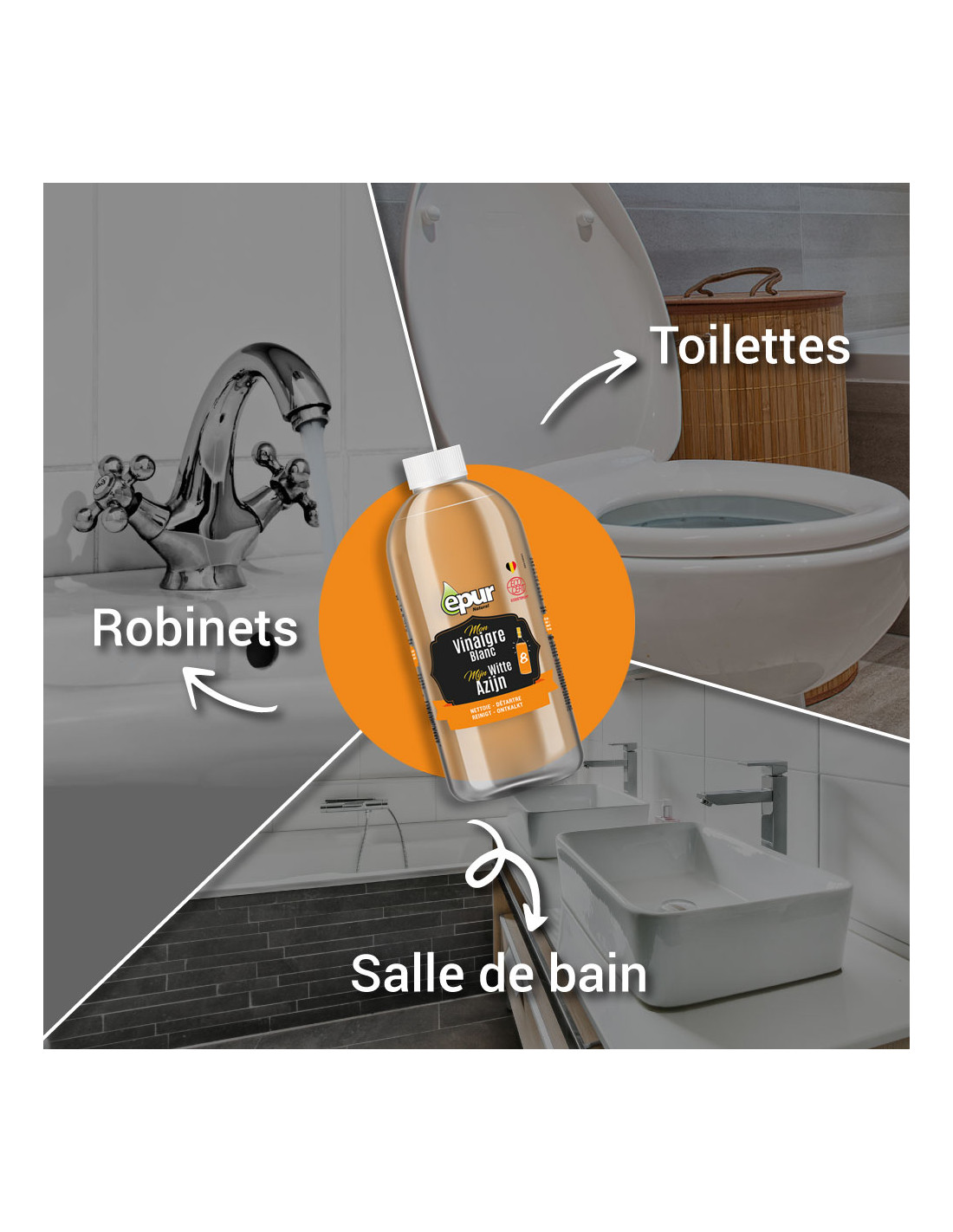 À base de Vinaigre d’alcool très concentré (14°), le Vinaigre nettoie et détartre efficacement toute la maison (Oui, oui, toute la maison, c’est promis !). Il est idéal pour nettoyer, en alternative à l’eau de javel très toxique, la salle de bain, la WC, la cuisine, … bref, chaque recoins de la maison et en plus, c’est naturel !